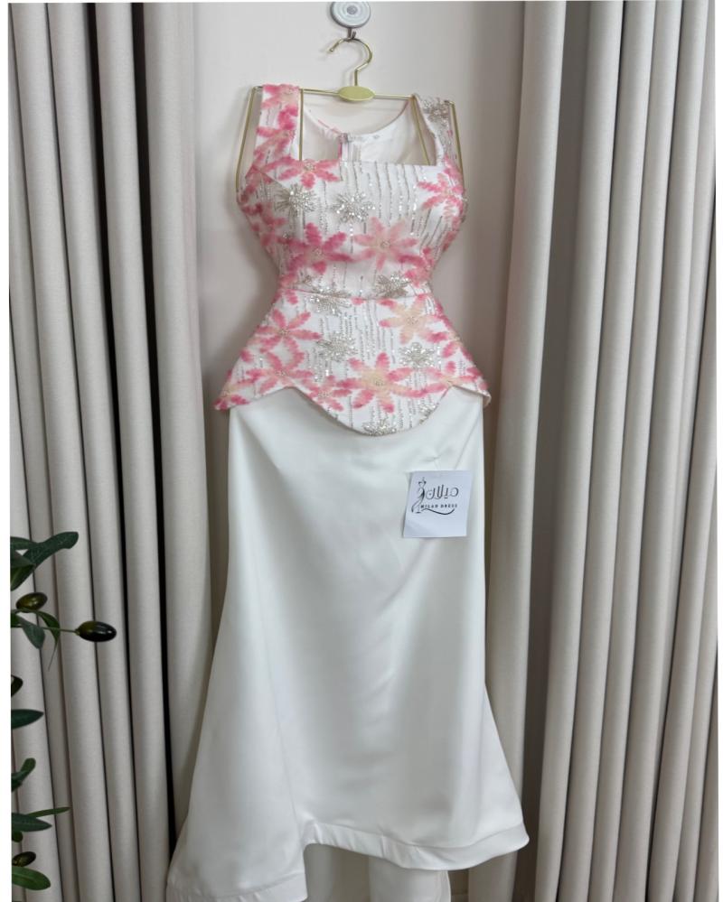 * اسم الفستان : فستان حنان* اللون : ابيض / وردي* إرشادات الغسيل : يُغسل ويكوي بالبخار وبدرجة حرارة منخفضة .* طريقة القياس :الصدر ، الخصر ، الورك .استخدمي شريط قياس قماشي يمكن شده حول جسمك لقياس دقيق .