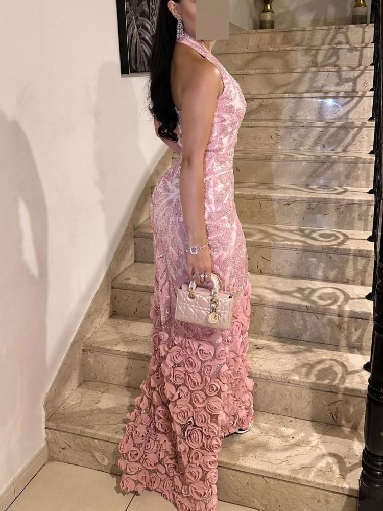 - الجزء السفلي: يتميز بذيل طويل مغطى بورود ثلاثية الأبعاد (3D flowers) تضيف عمقاً وفخامة ولمسة رومانسية