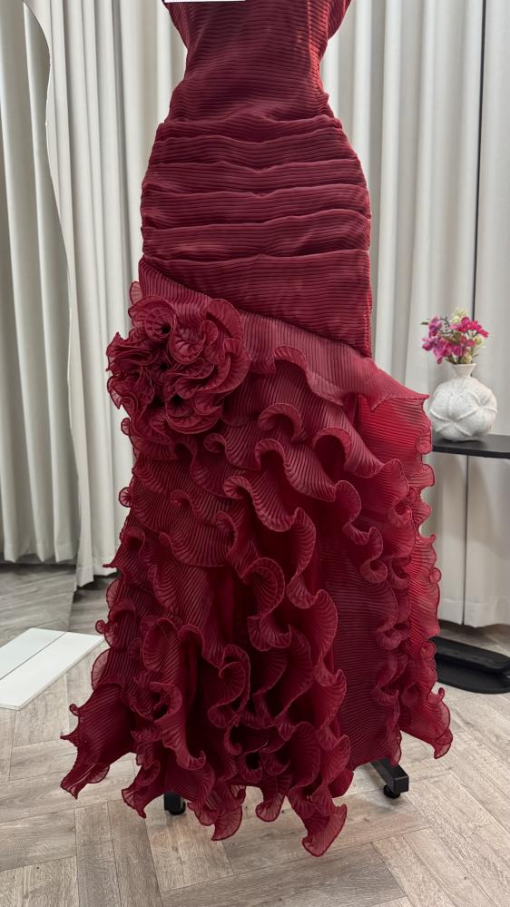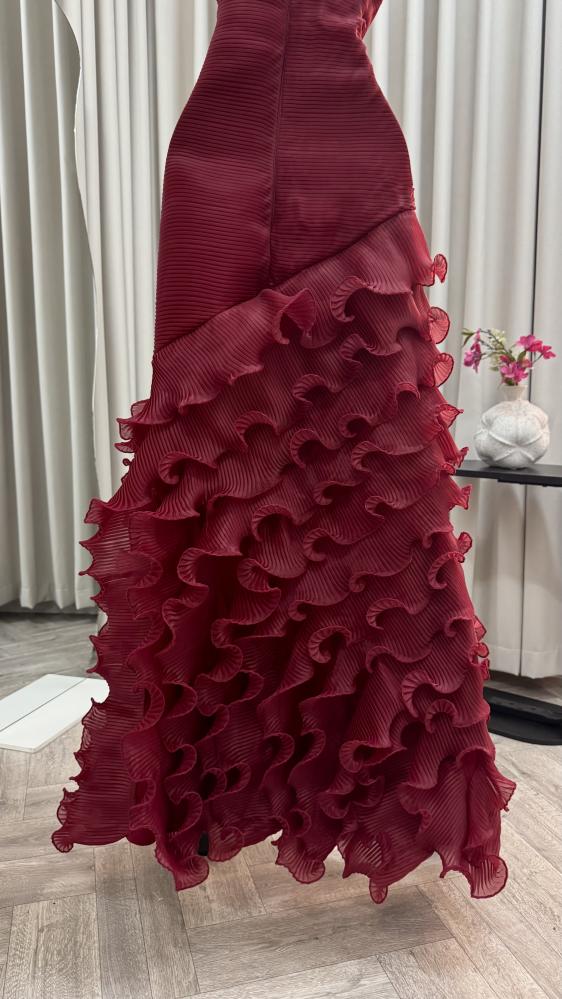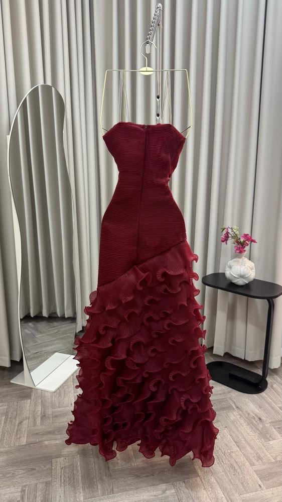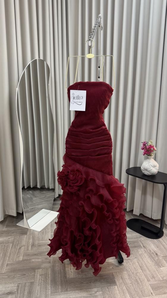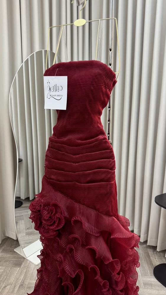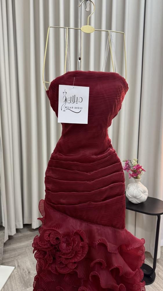 الفستان أنيق جدًا بلون خمري (عنابي داكن) بقماش مطوي بشكل طولي يعطي ملمس مميز وفخم. تصميمه بدون أكتاف (سترابلس) ويأتي ضيقًا من الأعلى إلى أسفل الخصر ليُبرز القوام.