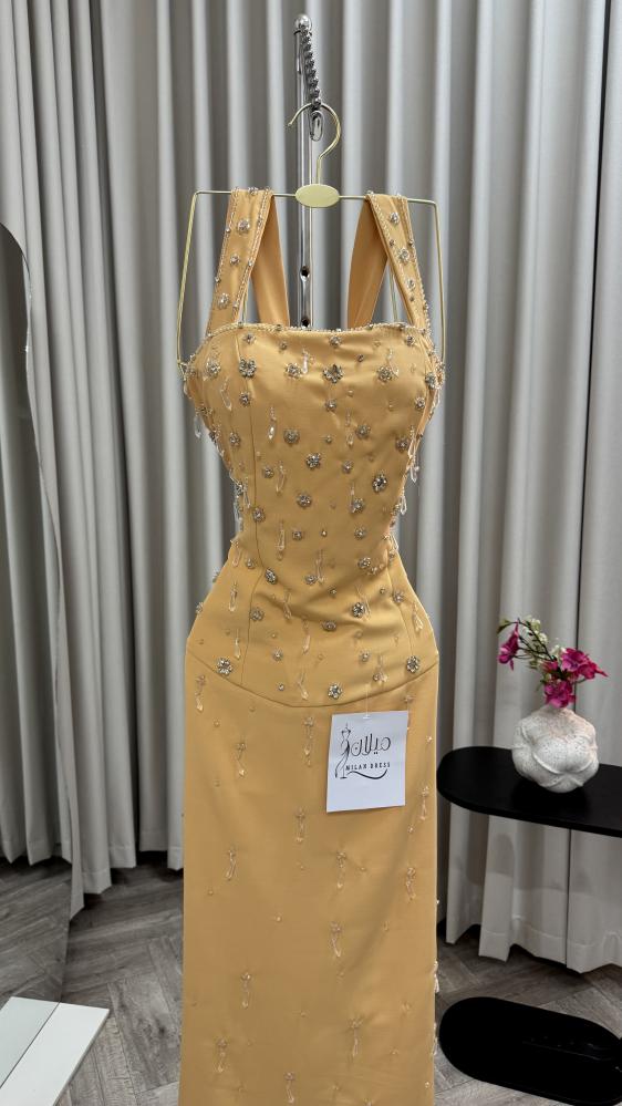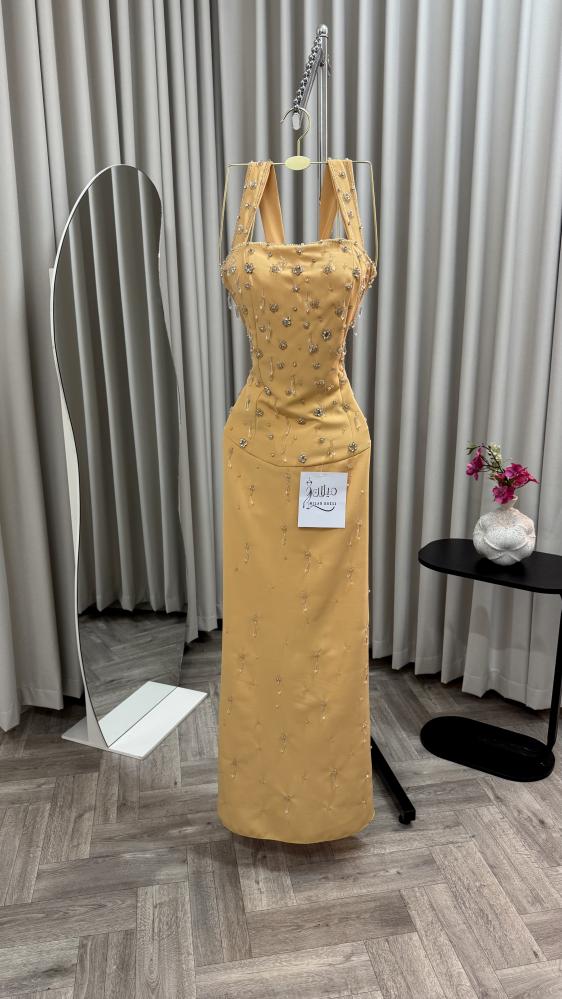من الأعلى، يتميز الفستان بحمالات عريضة مع فتحة صدر مربعة، ما يعطيه لمسة راقية ومتناسقة. الجزء السفلي بسيط وناعم، مستقيم الساقين بدون كشكشة أو فتحة، ليكمل مظهره الكلاسيكي الفخم