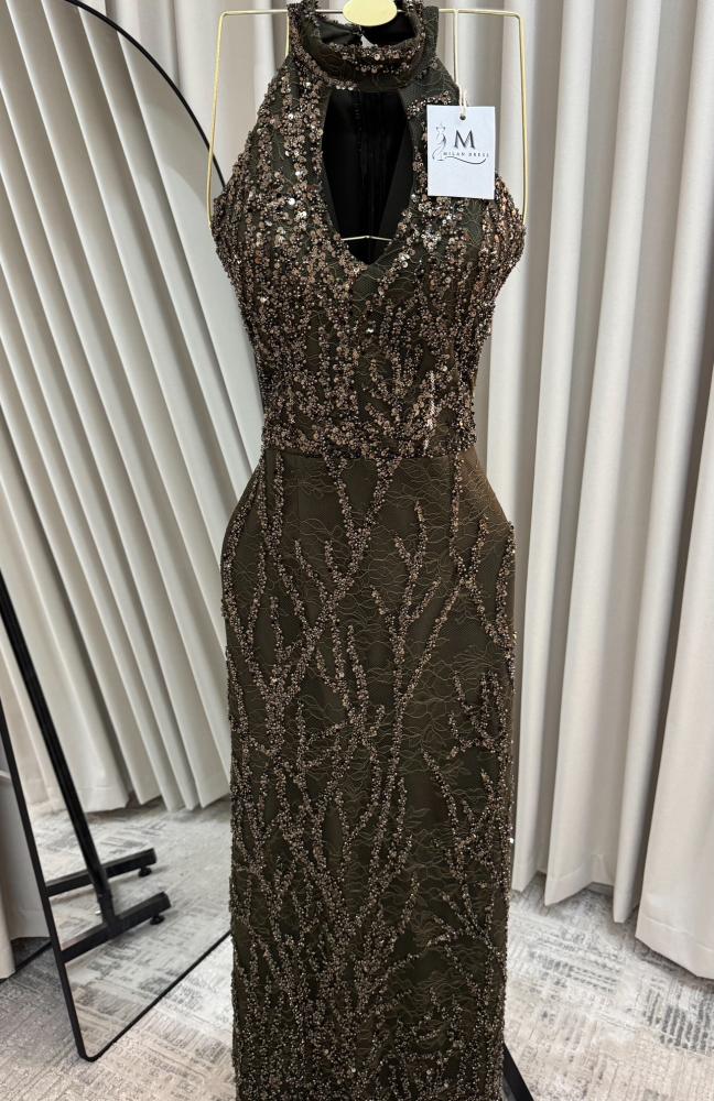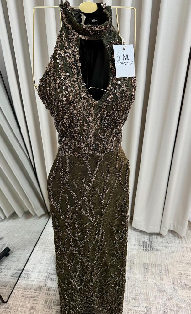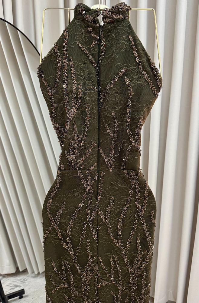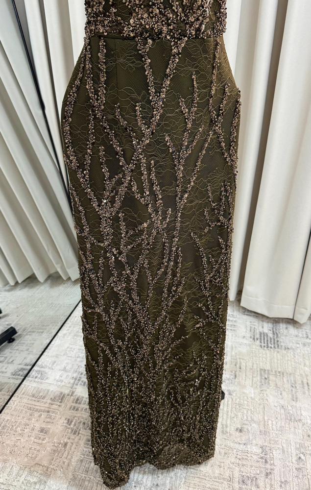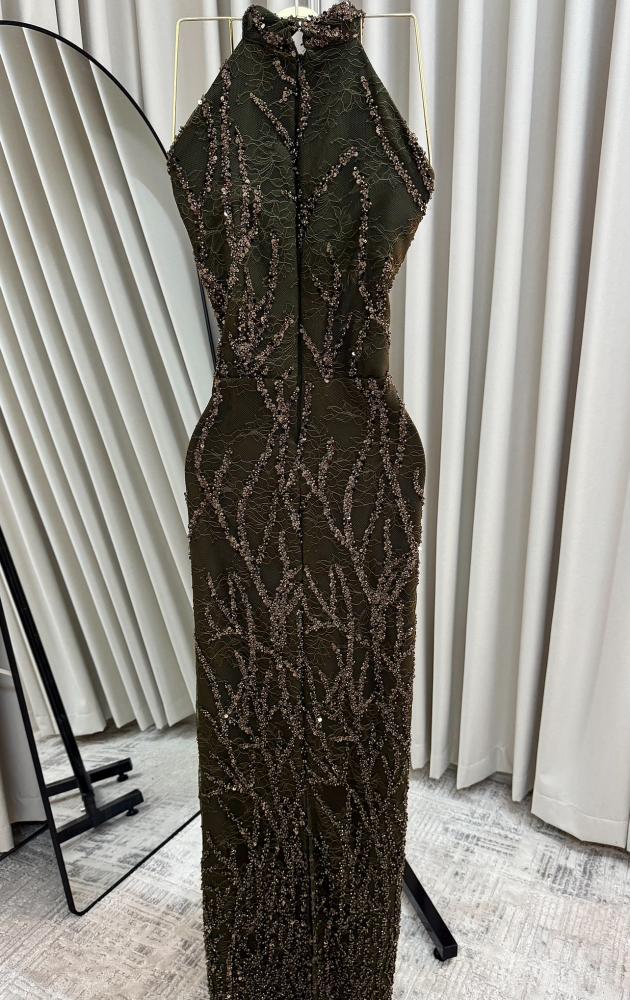 - القماش: القماش مزين بتطريز فاخر كثيف من الخرز والترتر البرّاق بلون نحاسي، ويأخذ شكل فروع أو نقوش نباتية ممتدة على كامل الفستان.