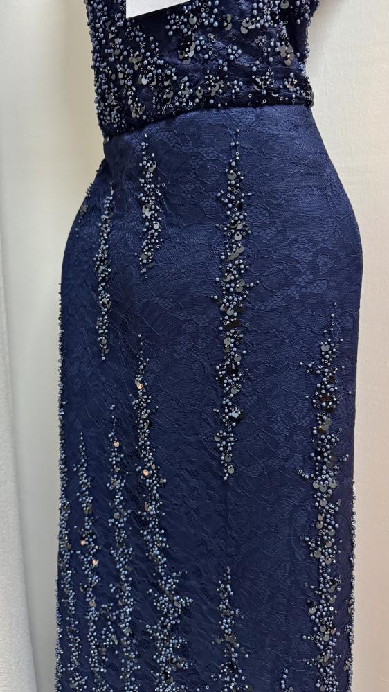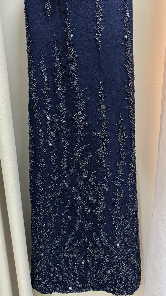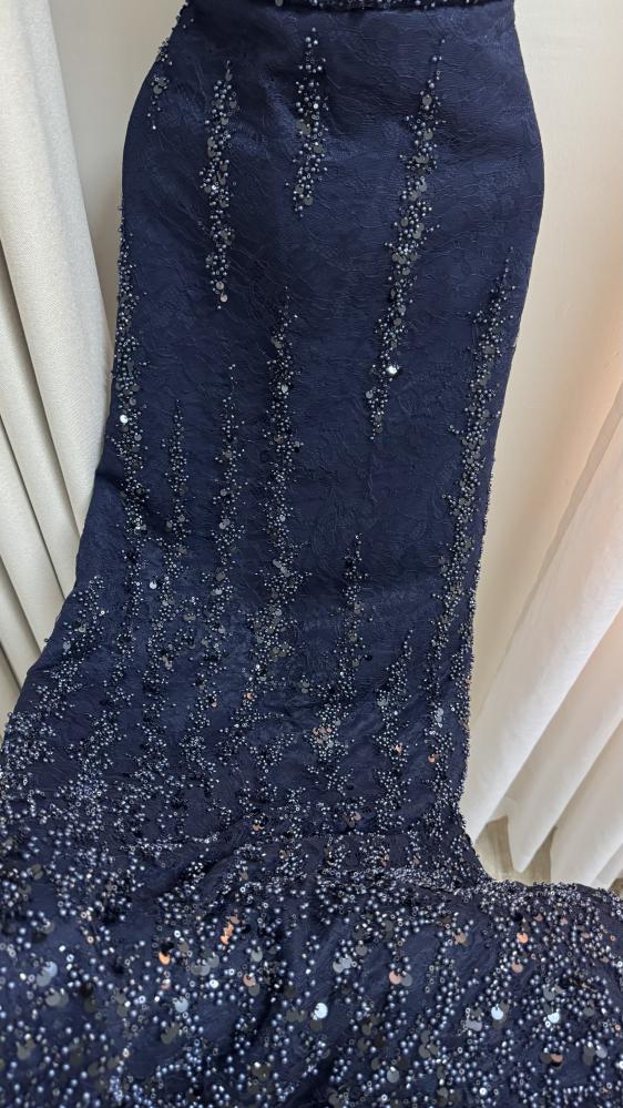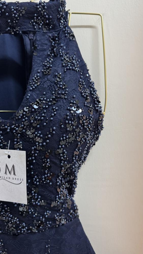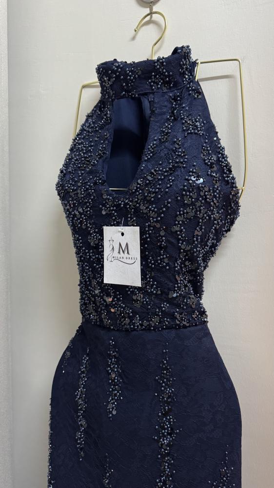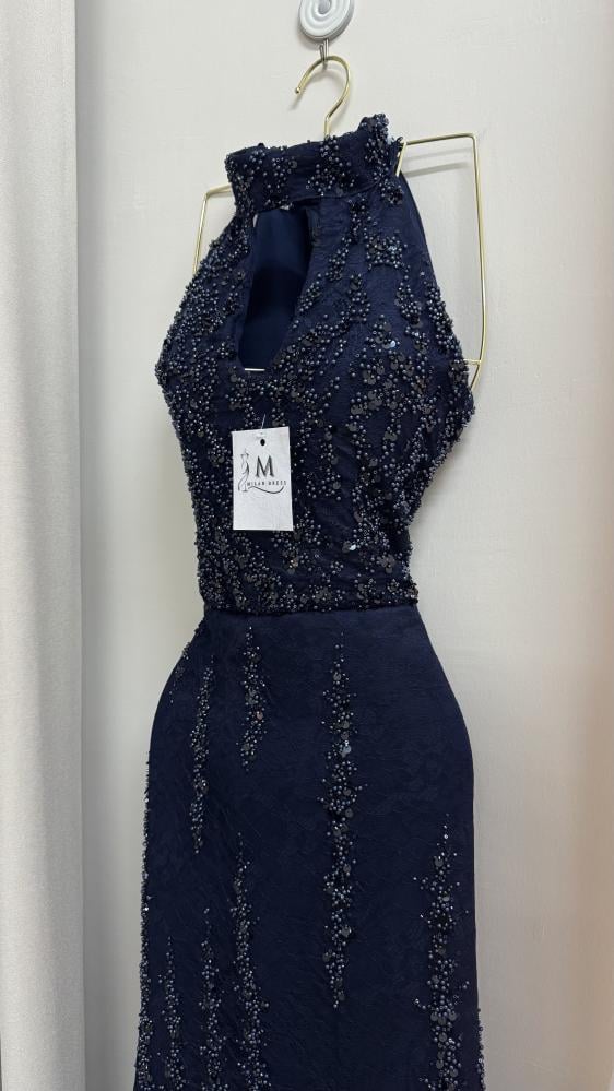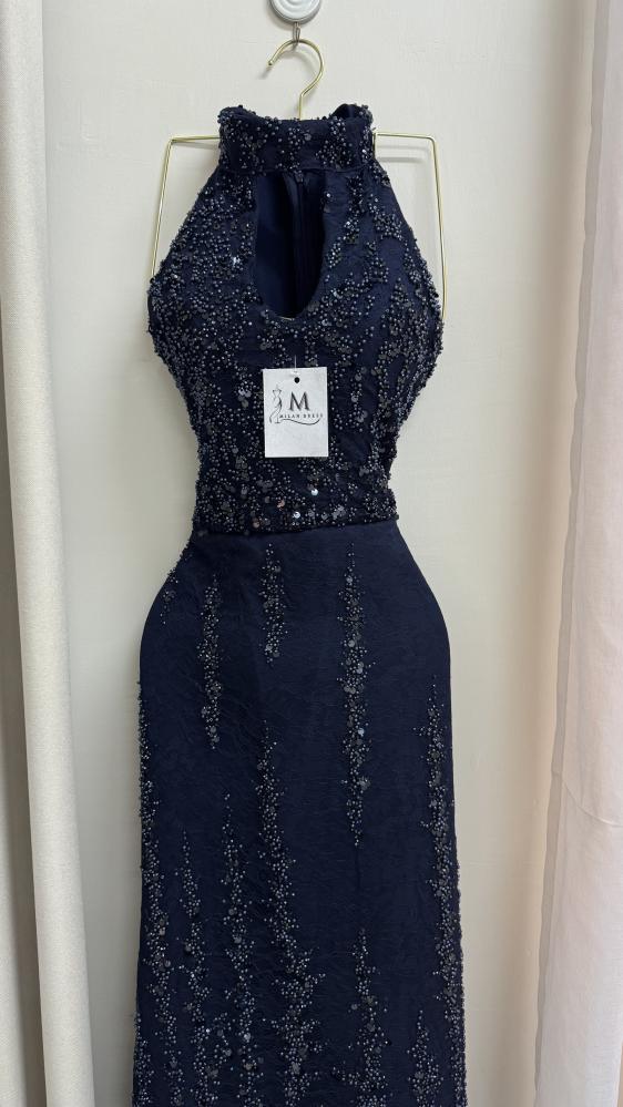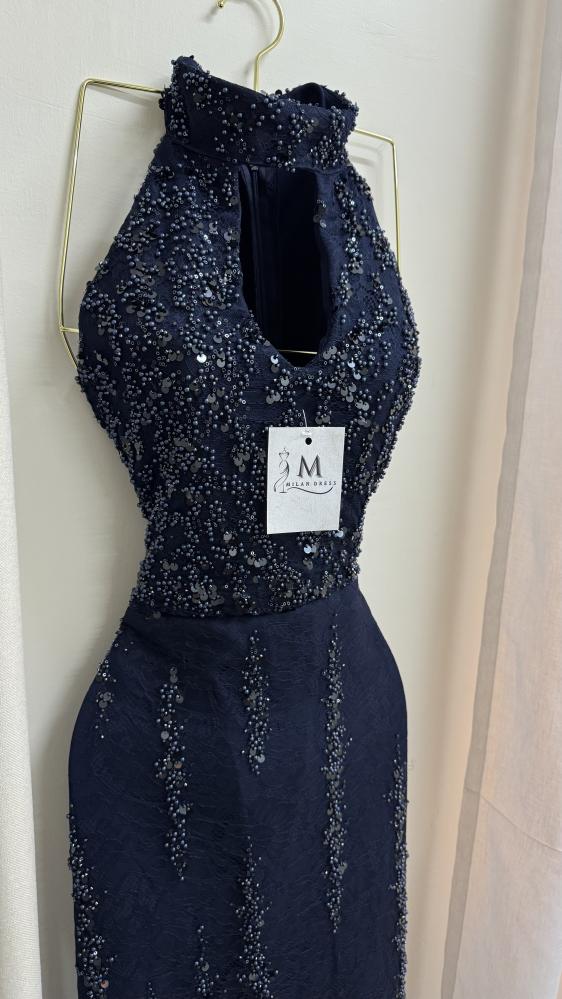 الفستان طويل بلون كحلي غامق، بتصميم ضيق يبرز القوام. الجزء العلوي بدون أكمام وبقَصّة هالتر مع فتحة صغيرة في الصدر، ويتميز بتطريز كثيف بالخرز والترتر اللامع الذي يغطيه بالكامل. التطريز يمتد بشكل عمودي على التنورة لإعطاء إيحاء بالطول، ويضفي لمعة فاخرة وأناقة لافتة، ما يجعله مناسب للمناسبات المسائية أو السهرات